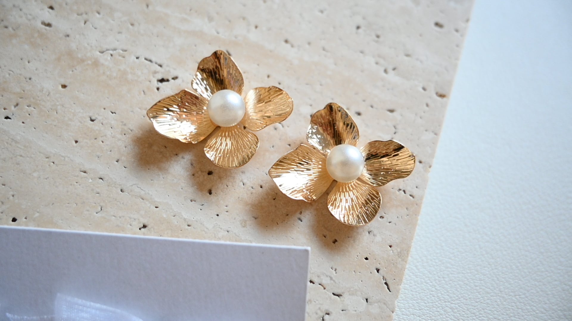 ●フラワー ピアス/イヤリング (小サイズ) お花の真ん中にパールがついた ピアス/イヤリングです♡ カラーはゴールドとシルバーから お選びいただけます♪ こちらはお花が 小サイズの商品となっております。 大サイズはこちらから✴︎ https://eternityhm.official.ec/items/72879112 結婚式や前撮り成人式などにもおすすめ 耳元が一気に華やかに 目を惹くデザインなので ブライダルアクセサリーとしても人気です✴︎ 同じお花をモチーフにした ヘアピンも販売中です 耳元とヘアセットをお揃いにするのも 統一感が出ておすすめです♡ ピアス(イヤリング)とヘアピンの お得セットはこちらから https://eternityhm.official.ec/items/73480935 ピアス/イヤリングについて 金属アレルギーの反応がでにくい ニッケルフリーのメッキ処理をした 金具タイプを使用しております。